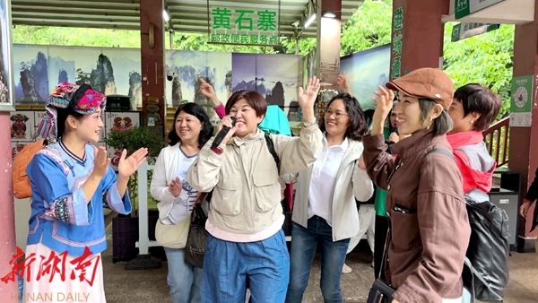 在黄石寨景区管委会,工作人员与游客互动对唱。(易鹏飞 摄)