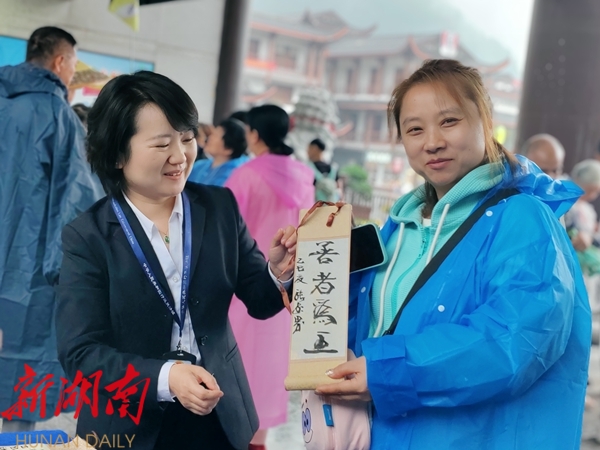 吴家峪门票站开展“端午传情 书法暖心”活动,为游客送去书法作品。(罗接生 摄)