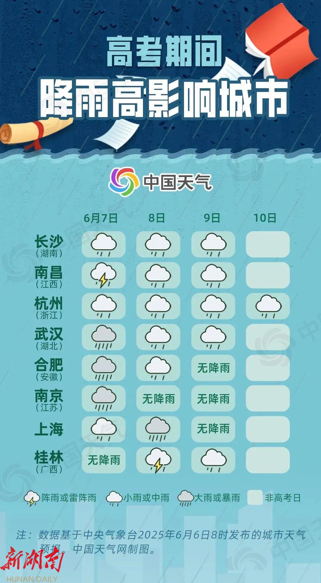 高考期间南方多地将现强降雨、强对流天气 ,湖北、安徽、江浙沪、江西、湖南、贵州等地有暴雨,局地大暴雨 ,部分地区或现雷暴大风、冰雹 等强对流天气。