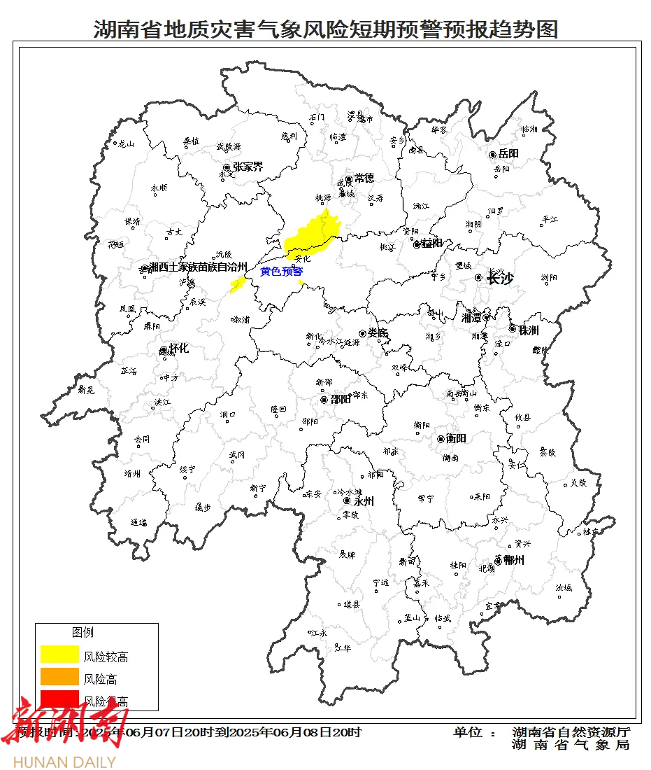 根据地质灾害成灾规律和孕灾条件,结合2025年6月7日短期气象预报情况,省自然资源厅与省气象局联合会商得出如下结论:自6月7日20:00至8日20:00,受降雨影响, 湘西北的常德、益阳、怀化等市州山地丘陵区发生突发性地质灾害风险较高黄色预警。