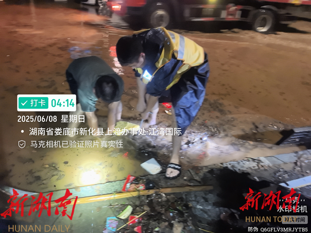 凌晨4点14分,新化城管正在打开窨井盖进行排水。