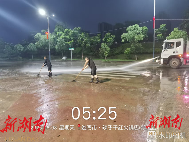 凌晨5点25分,新化城管正在用洒水车冲洗积泥。