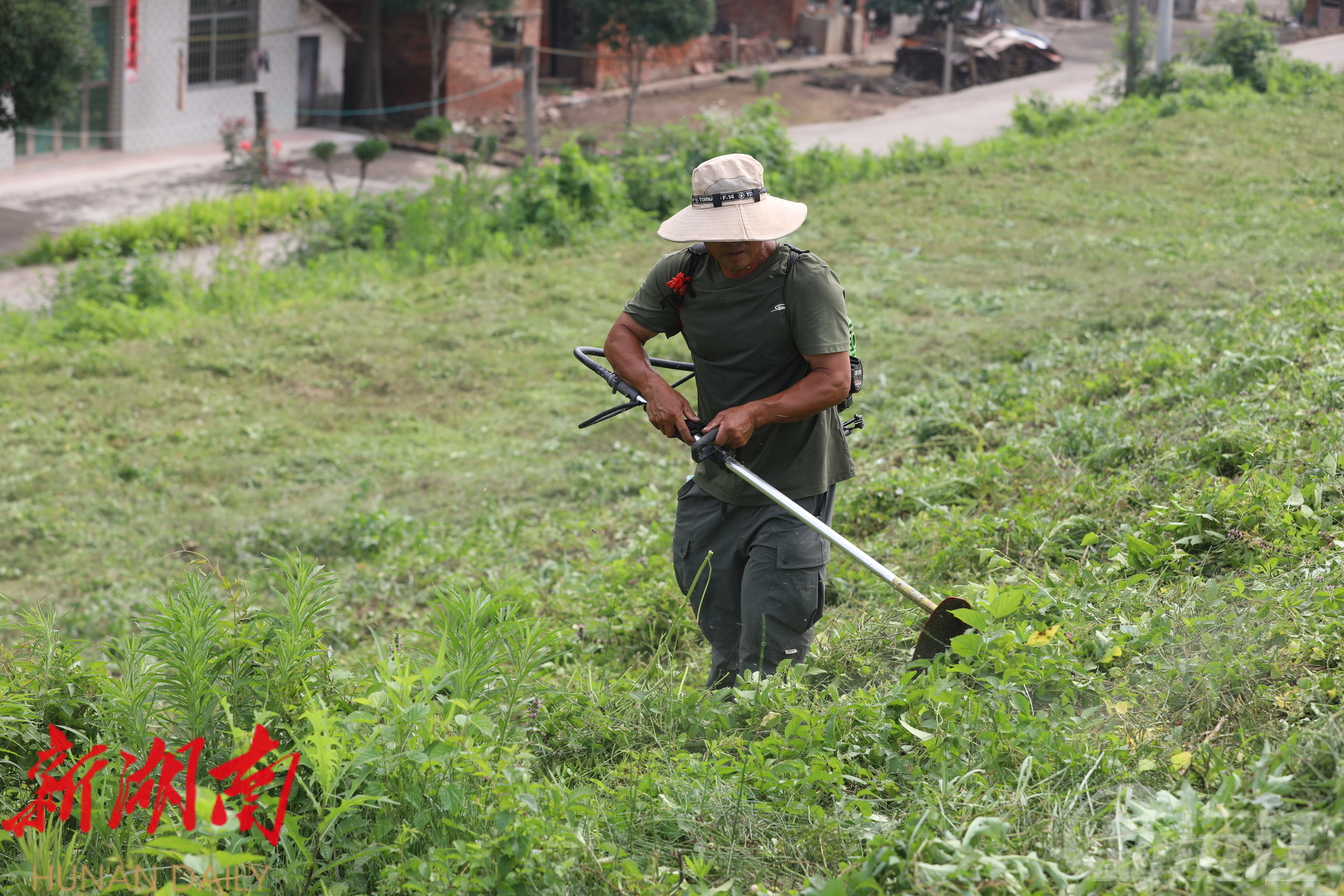 6月5日,烈日当空,沅江市草尾镇南堤一派繁忙景象。数十名和平村村民顶着35摄氏度的高温,正与防洪大堤上的茂密杂草“较劲”。他们中,一部分人挥动传统镰刀,砍伐青草;一部分人则熟练操作背负式割草机,机器轻轻一挥,堤坡杂草瞬间成片倒下。