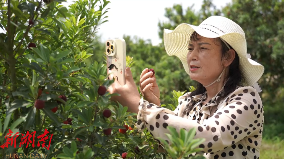“我就是通过朋友的介绍,相约一起来到这片杨梅基地,背着篓子来亲自体验一下采摘的乐趣。”游客潘存梅说,“我平常也喜欢搞这个抖音,也想通过自己的直播,利用自己的粉丝将我们中方杨梅基地推广宣传一下,让更多的游客了解到这片杨梅基地。”