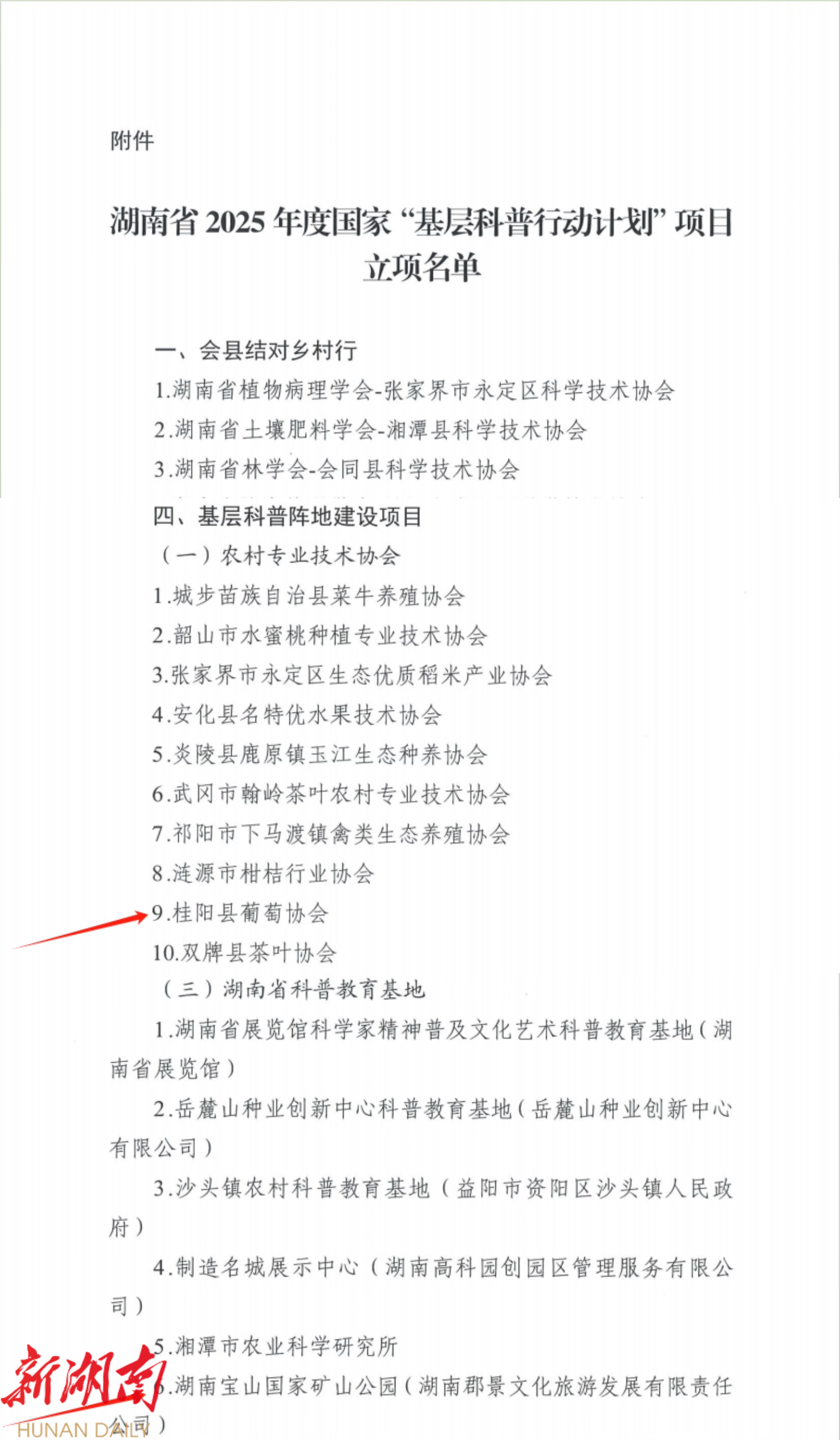 新桂阳6月9日讯(通讯员 史文飞)近日,从湖南省科协传来喜讯,我县成功申报2个2025年度国家“基层科普行动计划”-基层科普阵地建设项目,分别为桂阳县葡萄协会(农村专业技术协会)和宝山国家矿山公园(湖南省科普教育基地)。