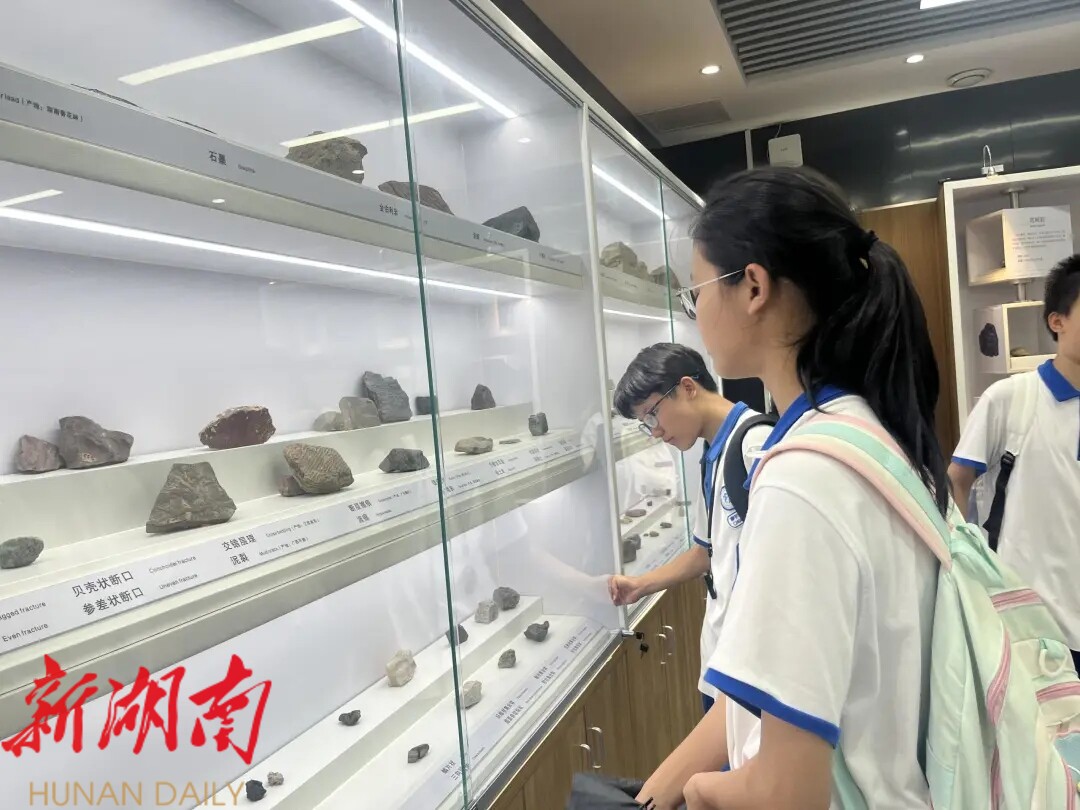 在地学博物馆内,嶙峋矿石与古老化石构筑了地球演化的无声剧场。生命科学学院标本馆则铺开一幅生物多样性画卷。来自湖南师大的本科生、研究生讲解员们,饶有兴致为“弟弟妹妹”们讲起科学的演进历程,循声而动,指尖所向,岩石密码与生命故事次第解开。少年们惊叹于自然伟力,科学探索的种子也悄然萌发。