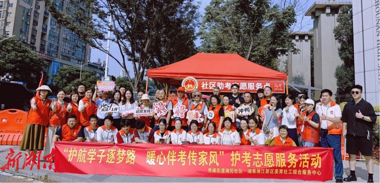 湖南日报·新湖南客户端6月9日讯(通讯员 祖江华 陈丽红)6月7日至9日,开福区秀峰街道湘民社区“护航学子逐梦路•暖心伴考传家风”高考护考志愿服务活动在周南中学考点持续开展。社区携手湖南湘江新区美育社工综合服务中心联动长沙市开福区星火联盟退役军人志愿服务中心、中石化长沙石油分公司、湖南医药集团、长沙北城发展有限公司、长沙农商行周南支行、维也纳酒店(周南店)等30多家辖区党建“薪火联盟”单位和160余名社区志愿者团队,以更全面、更精细的服务为高考保驾护航。