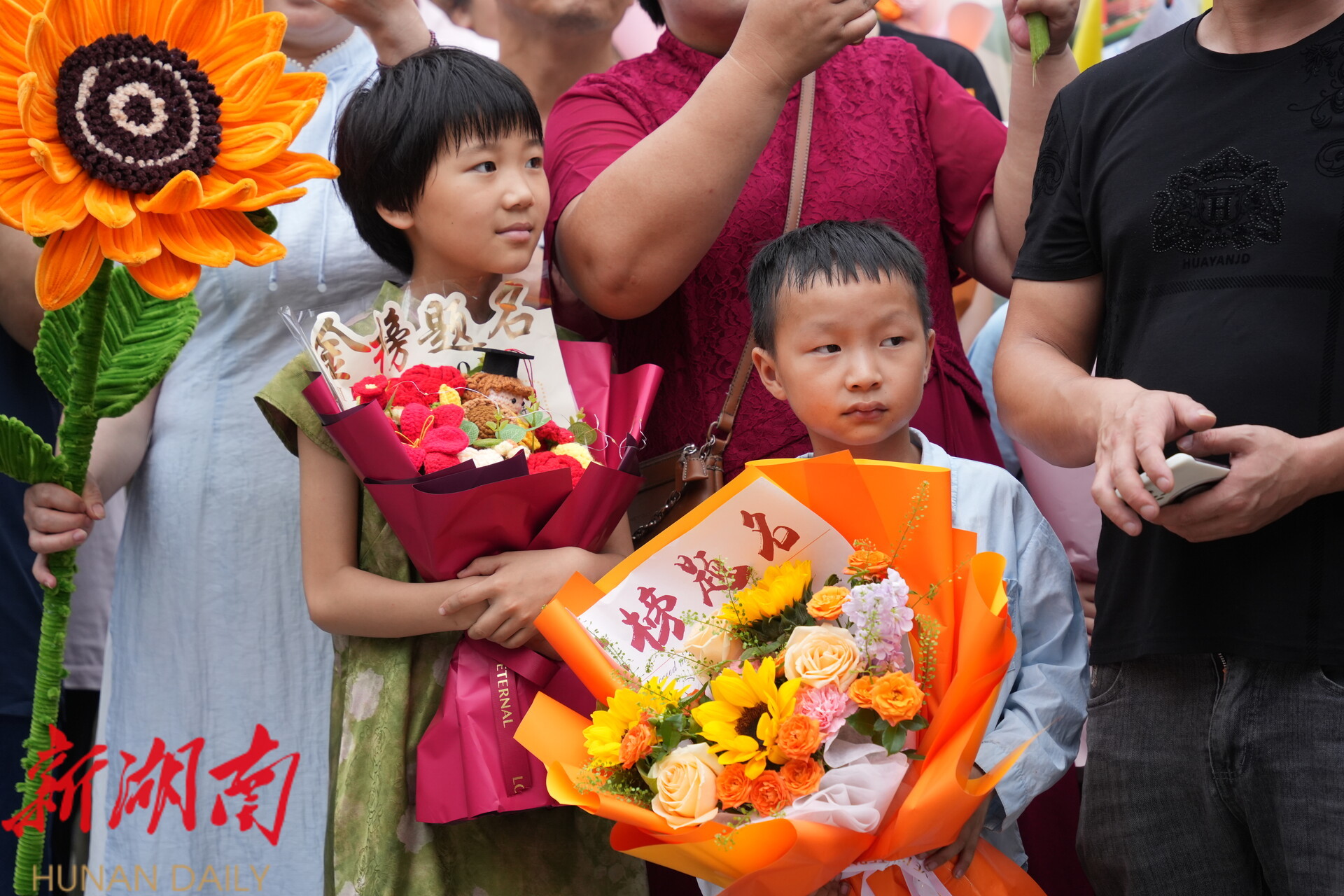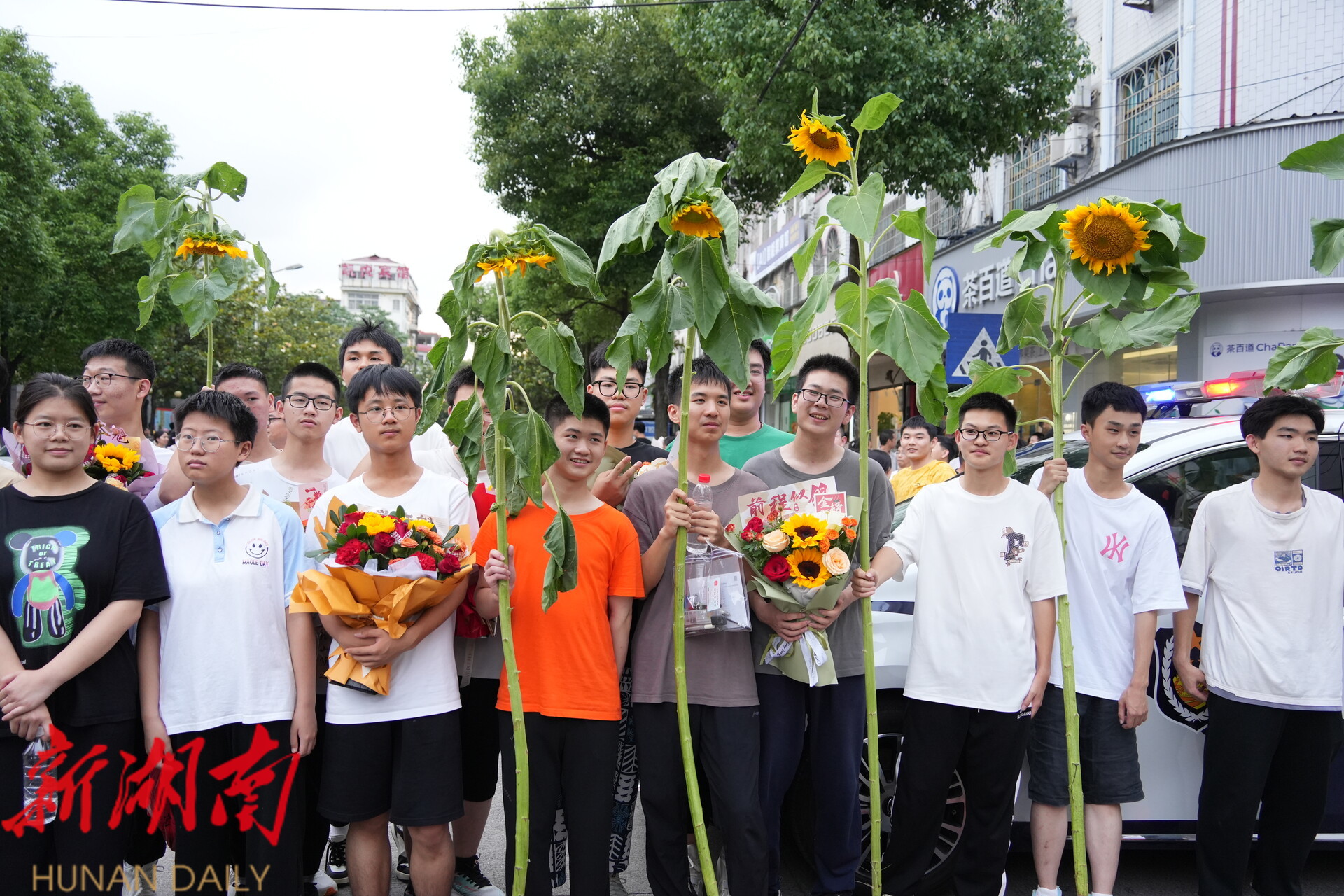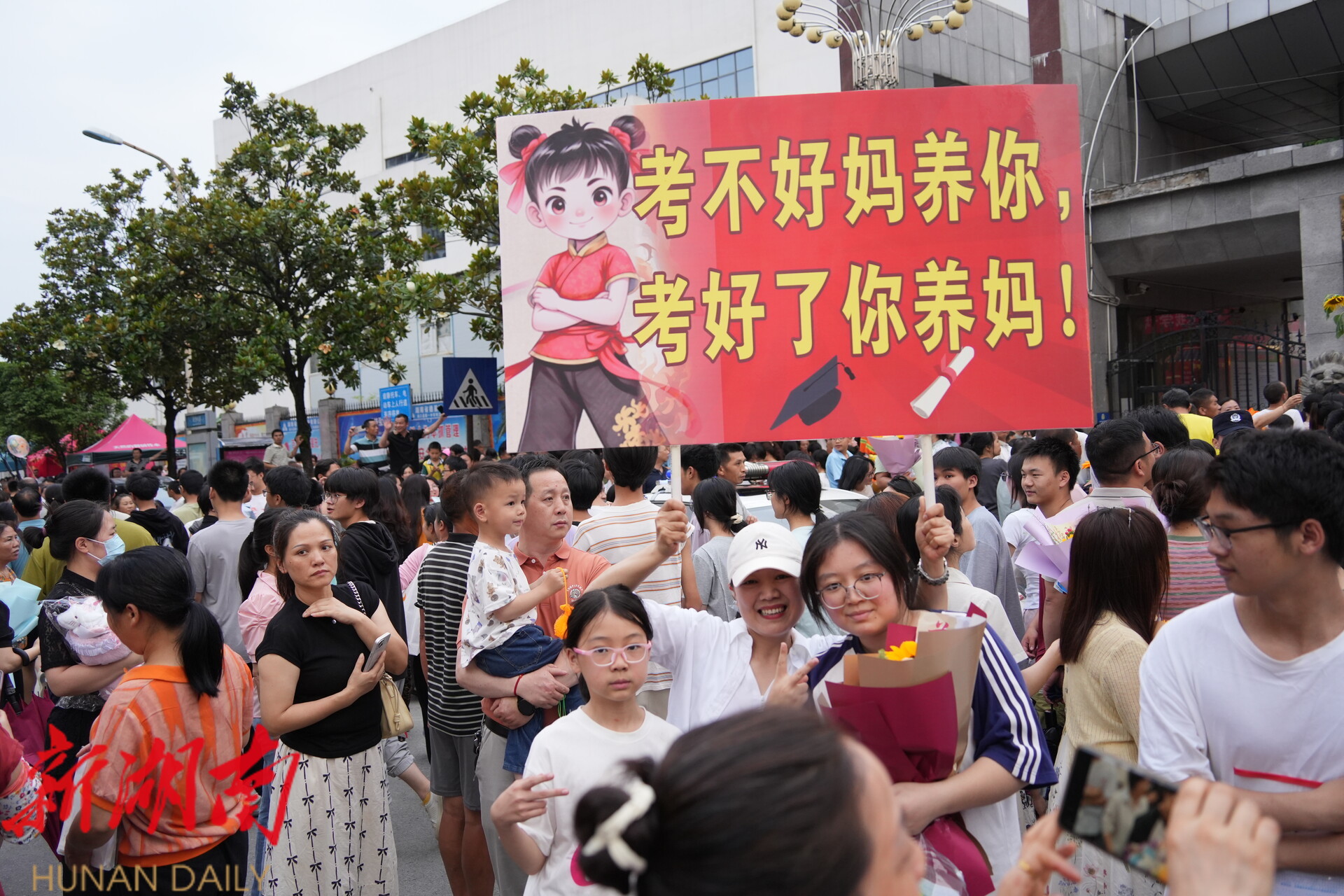 在洞口县多个考点外,亲友团抱着花、举着手机等候考生走出考场。亲友们为考生精心准备了象征一举夺魁的向日葵,还有气球、玩偶、零食、花束。家长们拉起横幅、支起展架花式迎接自己的孩子。“花里胡哨”是大家在紧张之余的一份调剂,也包含着对考生的美好祝福。
