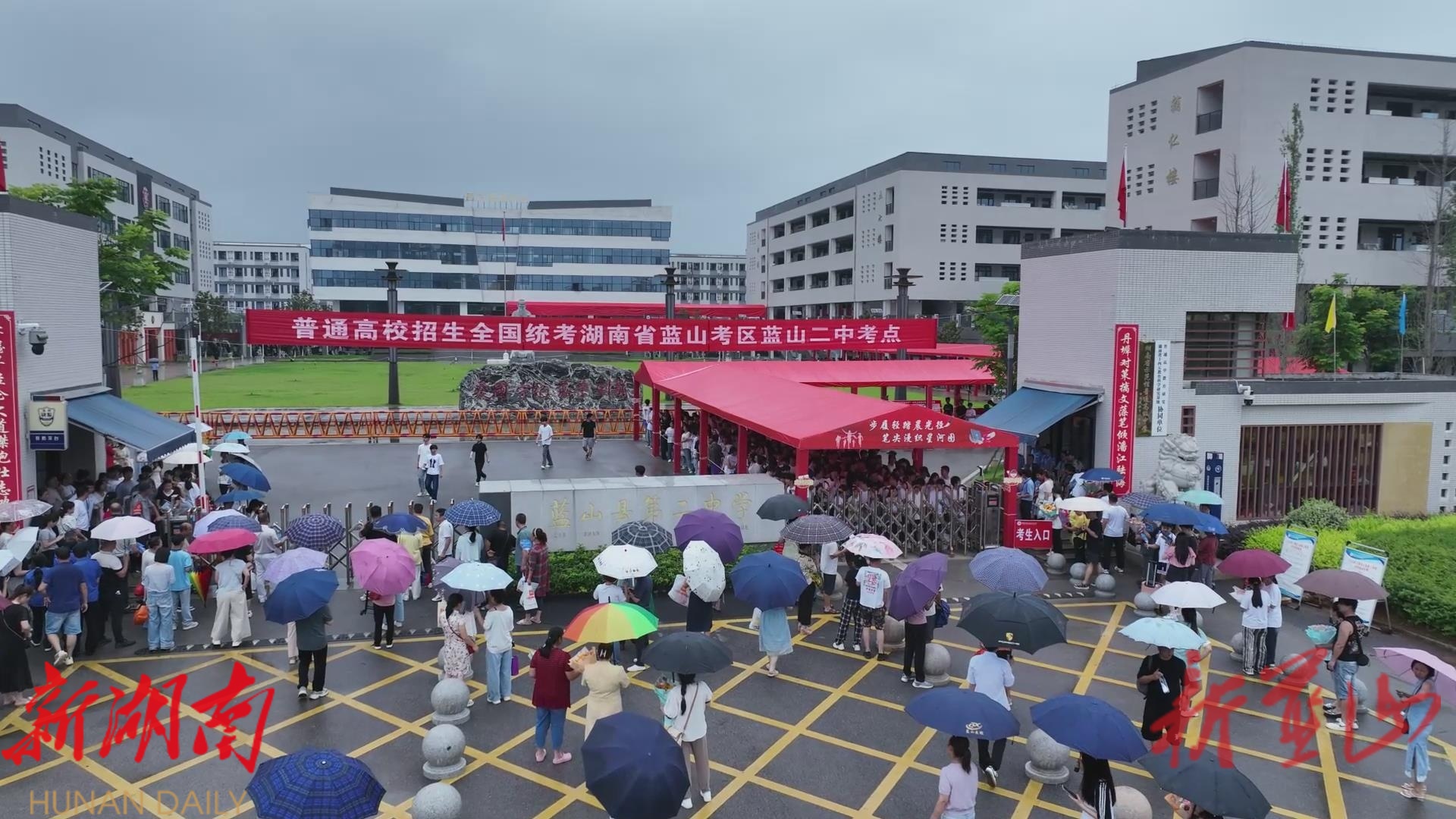 仲夏的阵雨突然地降落在蓝山县第二中学高考考点,考场外凉棚下早已站满了身影,不少学生家长翘首以待着孩子们的到来,他们攥着向日葵和花束的手微微出汗,无数道目光聚焦在考生出口的轮廓。