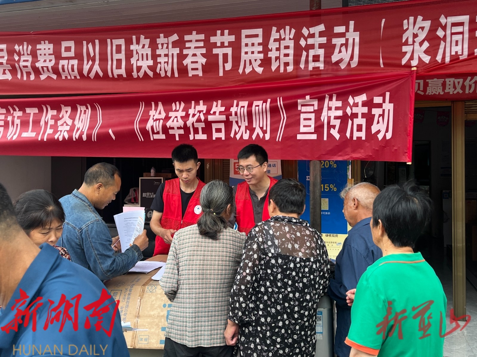 新蓝山客户端6月10日讯 (通讯员 成章刚 唐智立)6月9日,浆洞瑶族乡纪委利用赶集日人流量大的特点,组织纪检干部及新时代文明实践所志愿者组成“清风宣传队”,在乡集贸市场开展《信访工作条例》《检举控告规则》专题宣传活动。纪检干部通过“摆摊设点”“流动宣讲”“互动答疑”等形式,将信访举报政策送到群众“家门口”,现场发放宣传资料200余份,推动信访举报工作从“被动接访”向“主动服务”转变。