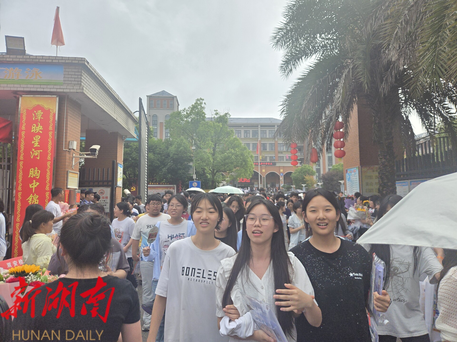 在桂阳三中、桂阳一中和龙潭中学考点外,不少家长手捧向日葵、玫瑰等鲜花,高举写着“金榜题名、青春无悔”等字样的创意横幅,等待考生凯旋。伴随着最后一门考试结束铃声响起,考生们飞奔出场,迫不及待地和家人、朋友热烈拥抱,合影留念,一同分享喜悦,为青春提交一份圆满答卷。