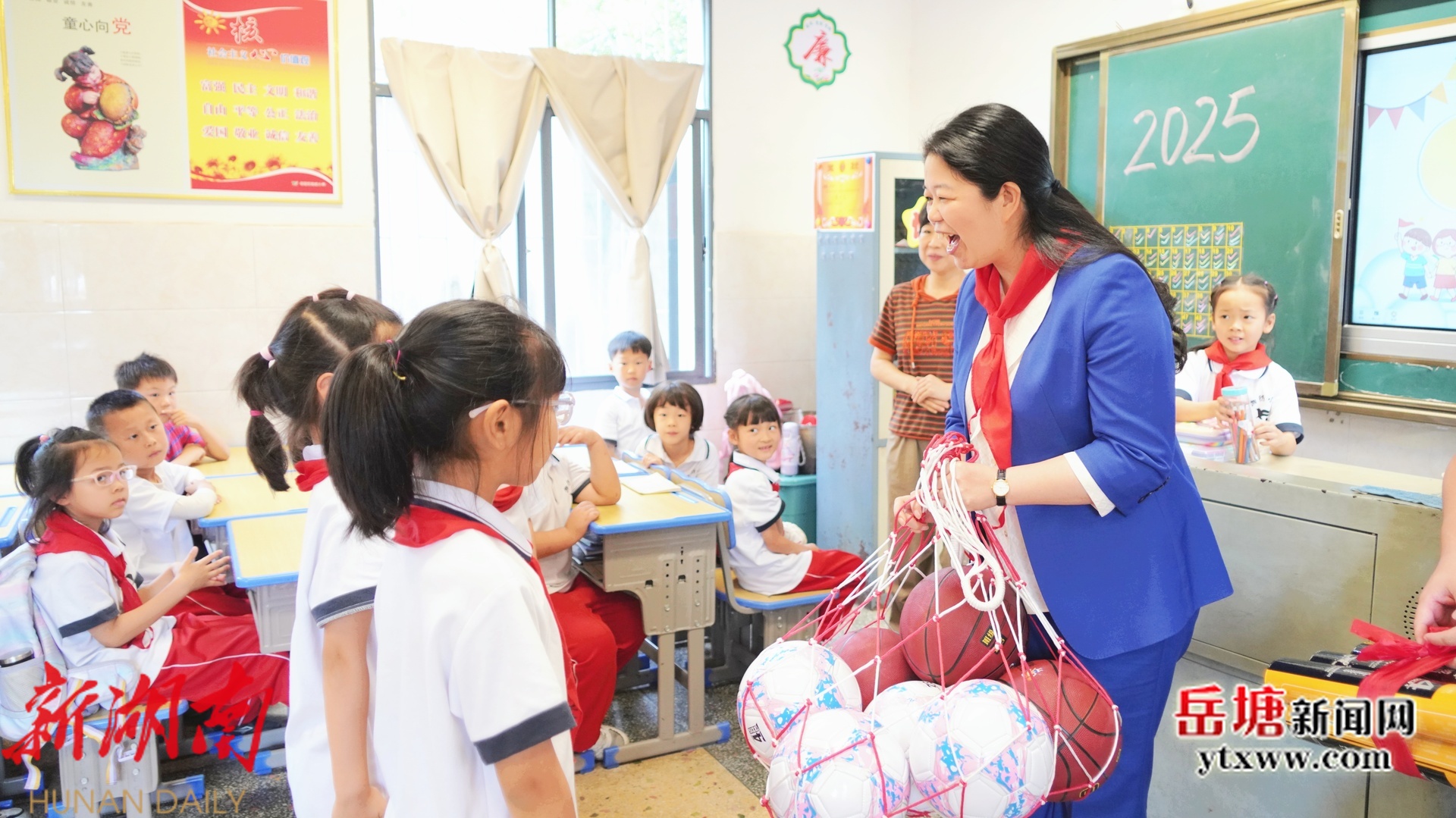 在湘纺小学,少先队员代表给周赏玲一行戴上鲜艳的红领巾。走进教室,周赏玲和孩子们亲切交流,为他们送上足球、篮球等运动器材,叮嘱他们努力学习、强健体魄,成为德智体美劳全面发展的社会主义建设者和接班人。
