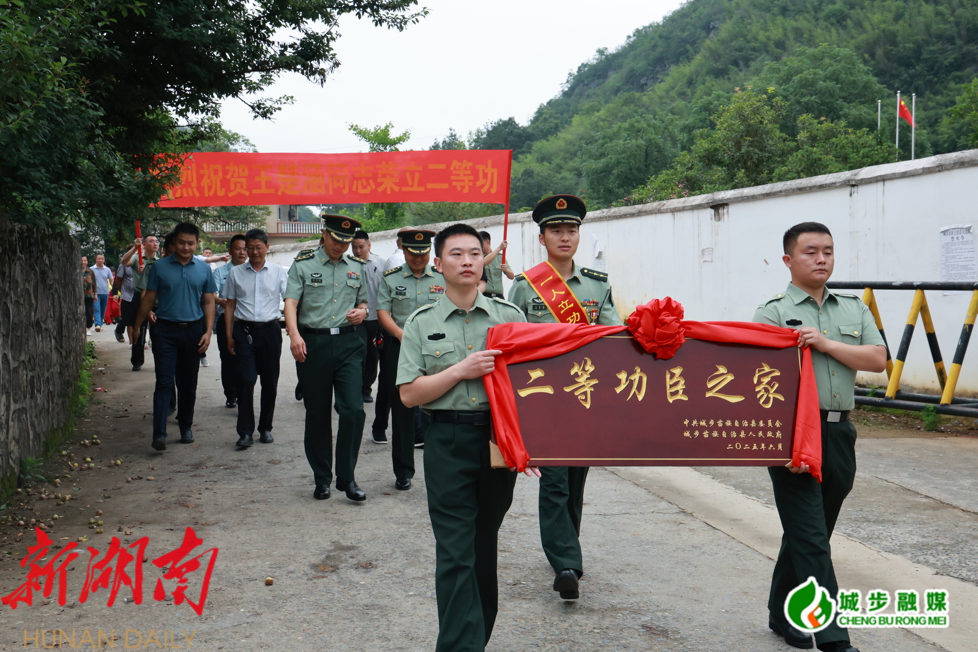 新城步客户端6月10日讯 (记者 阳远志 见习记者 肖彤丹 通讯员 宋豪杰)锣鼓声震云霄,绶带辉映荣光。6月10日,县人武部、县退役军人事务局、73091部队组成送喜报队伍,为在部队荣立二等功的现役军人王楚涵家庭送去承载着无上荣光的喜报与慰问。副县长周祖德、县人武部部长李金、73091部队政治部副主任陈玉军参加。
