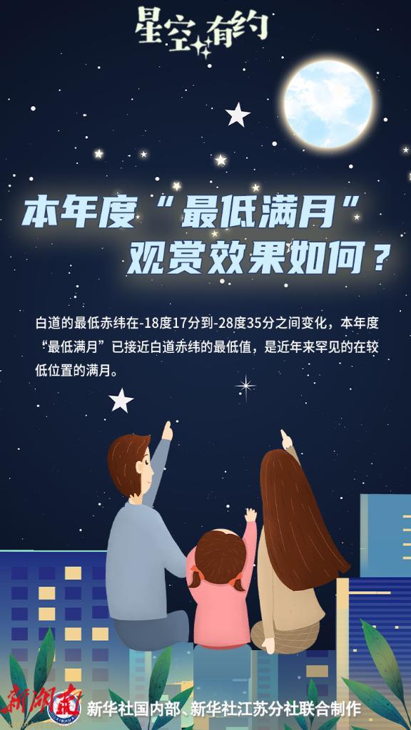 王科超说,今年的“最低满月”已接近白道赤纬的最低值,是近年来罕见的在较低位置的满月。由于存在视差,在北半球地面上看到的月球视赤纬甚至比其地心视赤纬更小,月亮也显得更低。以北京为例,6月11日午夜时分看到的月球视赤纬为-29度10分,月亮的地平高度不足21度,仿佛低垂地悬在地平线上。不过这也会带来非常美妙的景象,午夜推窗,月光盈满于室,有种别样的静谧。感兴趣的公众可尝试观赏。