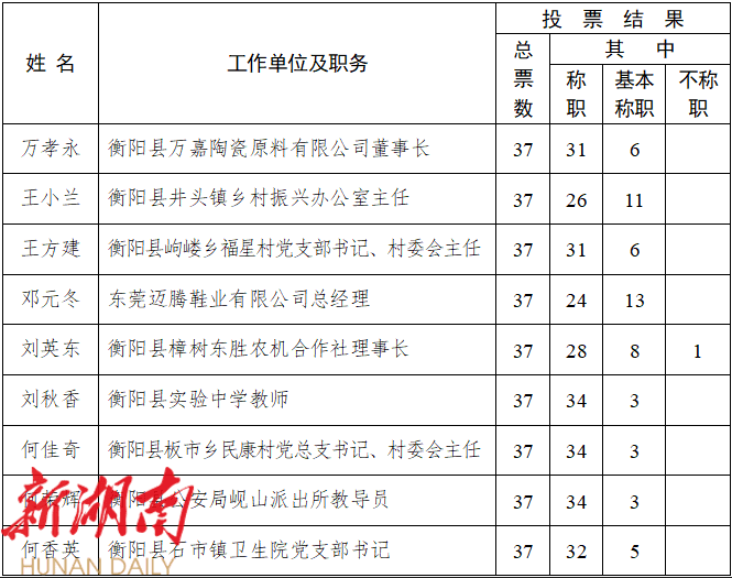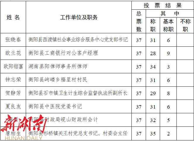 衡阳县第十八届人大常委会第三十三次会议依法对17名驻县市十六届人大代表述职情况进行测评,现将测评结果公布如下: