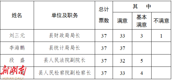 衡阳县第十八届人大常委会第三十三次会议依法对2024年度“一府两院”国家机关工作人员履职评议意见整改落实情况开展满意度测评,现将测评结果公布如下: