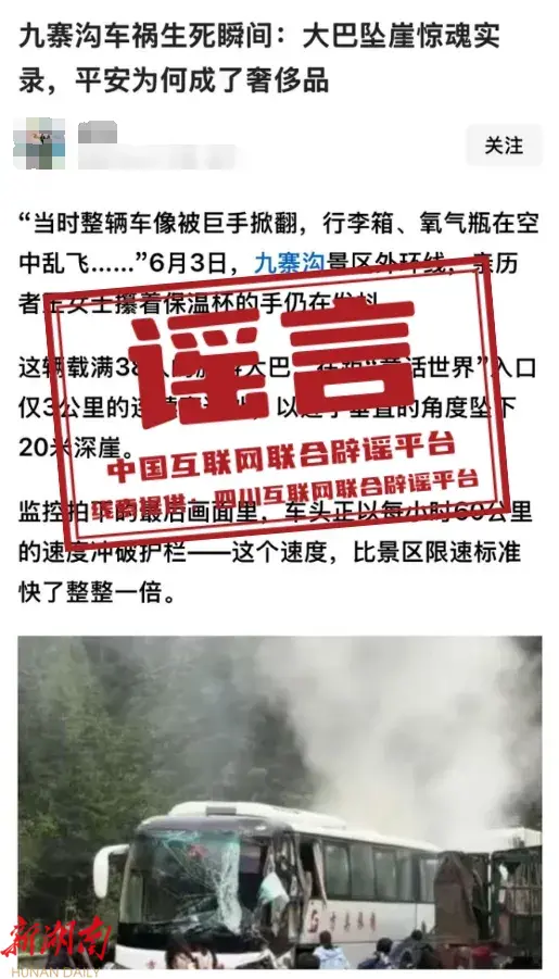 近日,有网民在网络平台发布帖文称“九寨沟景区外环线发生大巴车坠崖交通事故”,引发关注。经四川省阿坝州九寨沟县公安局核查,该信息纯属虚构,系个别网民恶意编造的谣言,九寨沟景区及周边区域未发生任何大巴坠崖事故。捏造、传播虚假警情是违反治安管理处罚法相关规定的行为,公安机关将依法追究造谣者、传谣者的法律责任。(来源:四川互联网举报辟谣平台、“平安九寨”微信公众号)