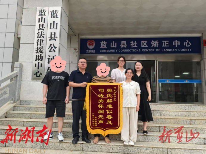 新蓝山客户端6月11日讯 (通讯员 李爱君)6月9日,受援人贺某及家属来到蓝山县法律援助中心将一面写有“排忧解难似春风 司法关怀润无声”的锦旗送至法援工作人员手中,以表感谢。