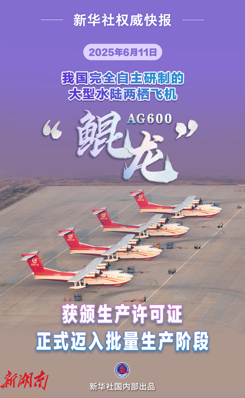 记者从中国航空工业集团有限公司获悉,6月11日,我国完全自主研制的大型水陆两栖飞机AG600“鲲龙”在广东珠海获颁中国民航局生产许可证。这一证件就好比飞机的“出生证”,标志着AG600飞机正式迈入批量生产阶段。