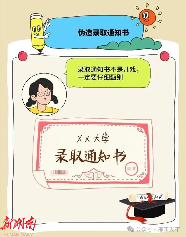 不法分子冒充高校招生办人员,向考生寄送伪造的录取通知书, 或者发送录取短信,让考生将学杂费打入指定账号,以此骗取钱财。考生和家长收到录取通知书后, 一定要通过官方指定的查询渠道进行录取信息验证,避免上当受骗。