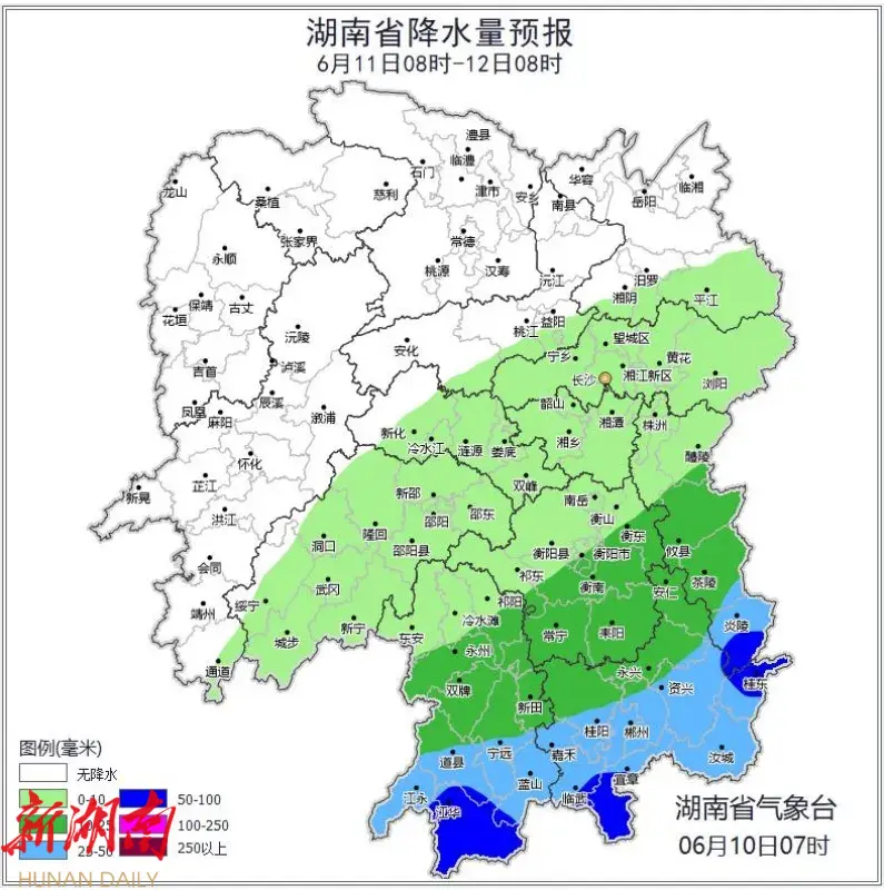 11日白天至晚上,湘中以南阴天有小到中雨,其中永州南部、郴州南部、株洲南部部分地区大雨,株洲(炎陵)、永州(江华、江永)、郴州(桂东、临武、宜章)局地暴雨,其他地区多云间晴天,12日清晨湘西北局地有雾;北风2~3级;最高气温29~34℃,最低气温21~24℃。