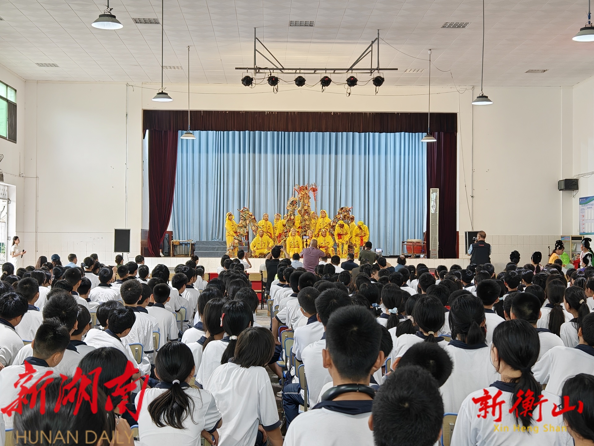 当天上午,文召中学礼堂鼓乐喧天,十几米长的席草龙在非遗传承人的控制中腾空而起,完成“穿龙门”“盘龙柱”等动作;随后岳北山歌、花鼓灯、师古民族乐器制作技艺等极具衡山本土特色的“精彩绝活”轮番上演,勾起了学生们强烈的好奇心;在神秘的光影剧场里,影子戏《岳母刺字》《八戒背妻》在幕布上跃动,通过传承人的生动操作,皮影人物仿佛被赋予了生命,关节灵活舞动,栩栩如生,再搭配方言俚语的精彩演唱,赢得了学生们的称赞和叫好。
