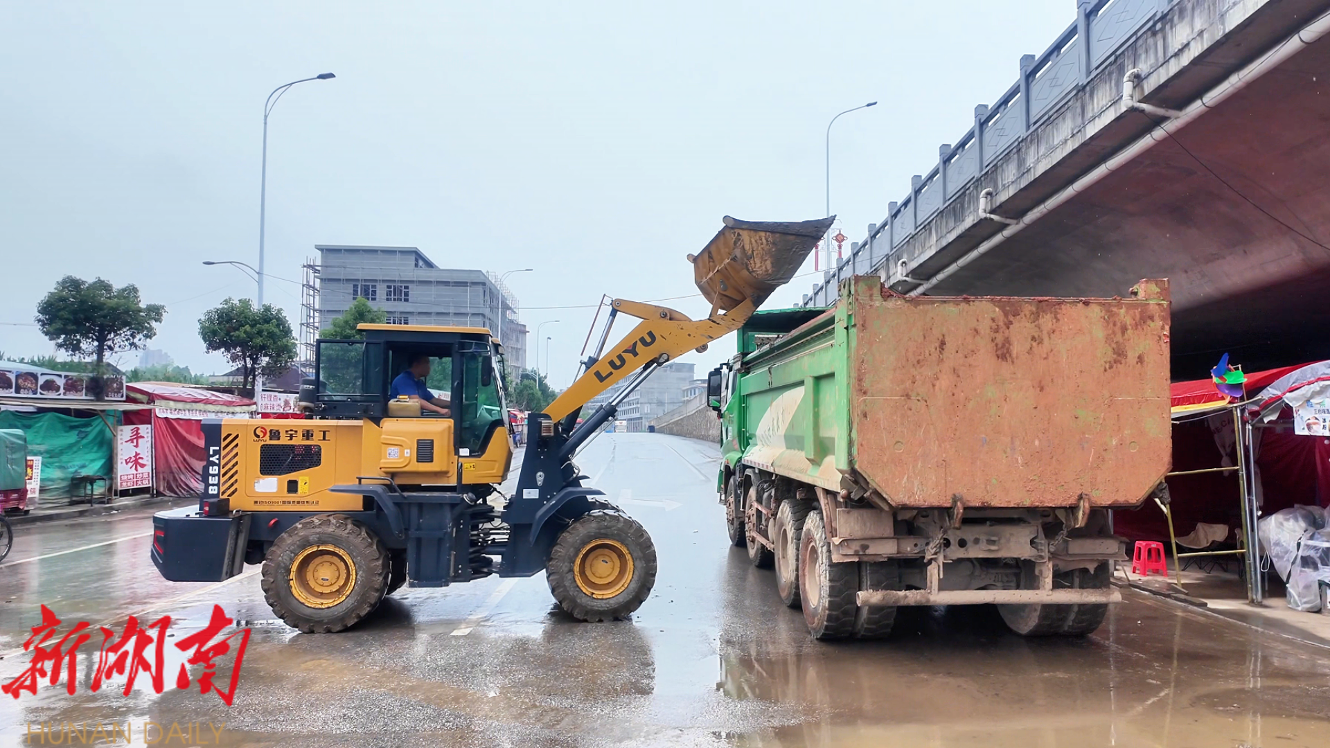 6月11日,在洞口三桥夜市现场,工人们与机械车辆紧密配合,形成“人机协同”作业模式。挖掘机挥舞巨臂,将厚重淤泥集中清运;拖拉机穿梭往来,及时转运淤泥;环卫工人们手持高压水枪,细致冲刷路面残留污渍,不放过任何一处死角。同时,工作人员还对下水井周边堆积的淤泥、树枝进行彻底清除,全力消除内涝隐患。