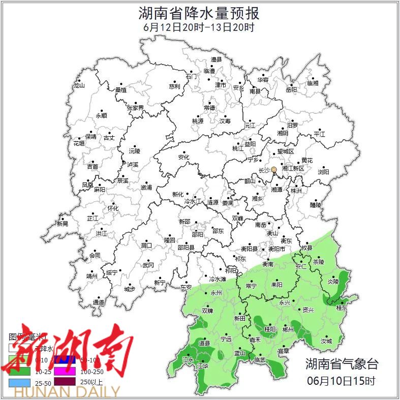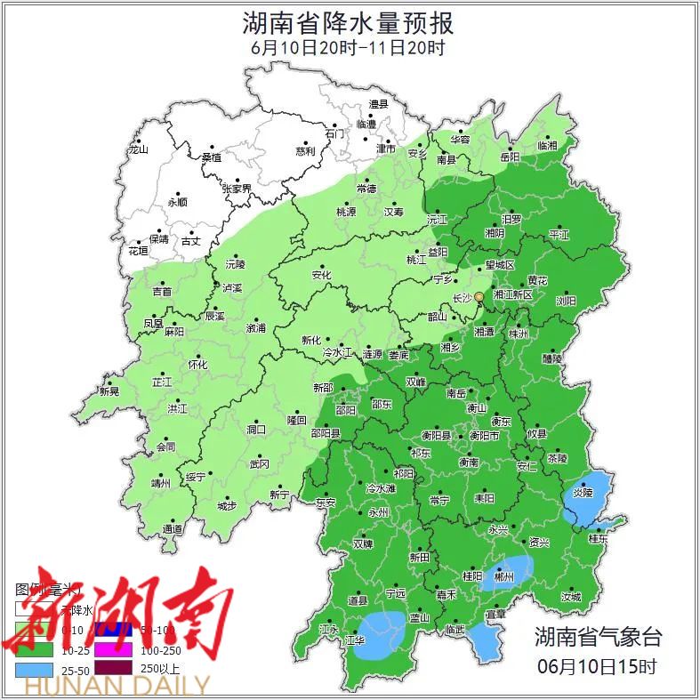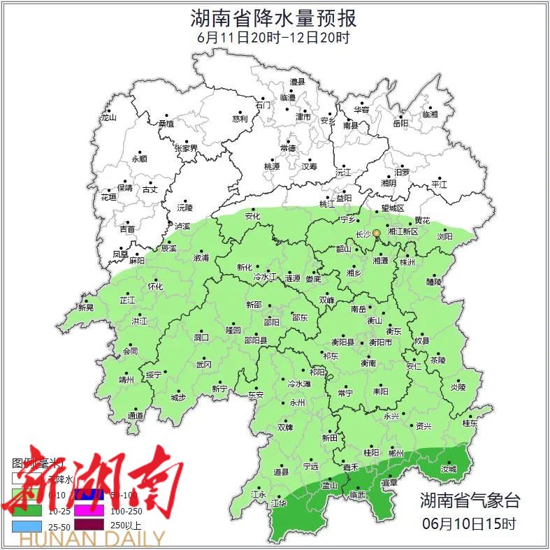 今天白天,湘西北多云间晴天,其他地区阴天有小到中雨,湘南局地大到暴雨,11日清晨湘西北局地有雾;北风2~3级;最高气温湘西北32~34℃,其他地区28~30℃,最低气温21~24℃。