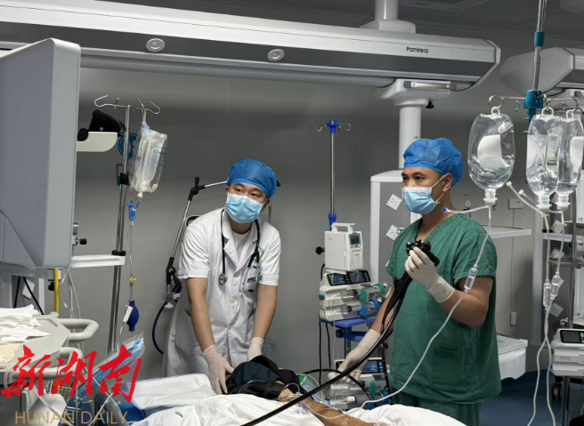 5月28日晚8时许,59岁的江先生因突发呕血1小时余被紧急送入宁远县中医医院。当时,他的呕血量已达数百毫升,并出现四肢湿冷、血压骤降、心率飙升、血红蛋白严重降低等休克症状,情况万分危急。急诊科团队迅速建立静脉通路,快速补液进行初步抢救,稳定生命体征后,第一时间将患者转入脾胃病科。