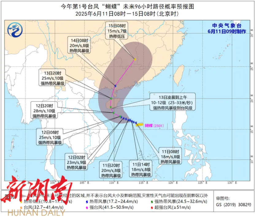 湖南省气象台首席预报员张海表示,将对湖南产生一定影响。预计1号台风“蝴蝶”将于6月14日至15日给我省湘东南带来较强风雨影响,最强降雨时段为14日晚至15日。具体预报:14日白天,湘东南小到中等阵雨或雷阵雨,局地中到大雨,其他地区多云有阵雨或雷阵雨。14日晚至15日,永州、郴州、株洲南部有大到暴雨,其中郴州南部局地大暴雨,并伴有7~9级阵风,其他地区多云有阵雨或雷阵雨。张海提醒,还需密切关注后期天气变化。