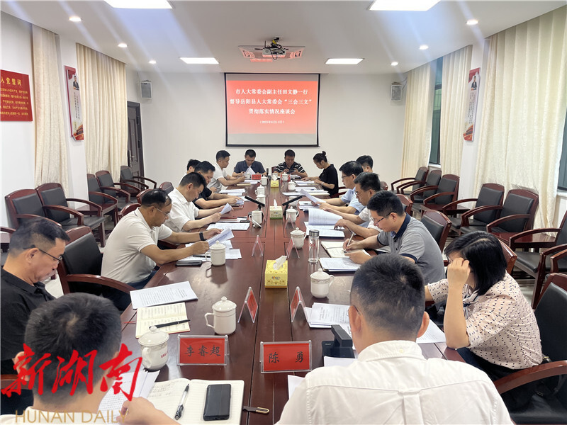 湖南日报·新湖南客户端6月12日讯(通讯员 付琴) 6月11日,市人大常委会副主任田文静来岳阳县督导“三会三文”精神贯彻落实情况,他要求,要坚持以“大抓落实”为主基调,以“三会三文”为主抓手,依法履职、守正创新,努力交出新时代岳阳人大工作高质量发展的崭新答卷。县人大常委会党组书记、主任周峰,副主任胡秉阳、任三星参加。