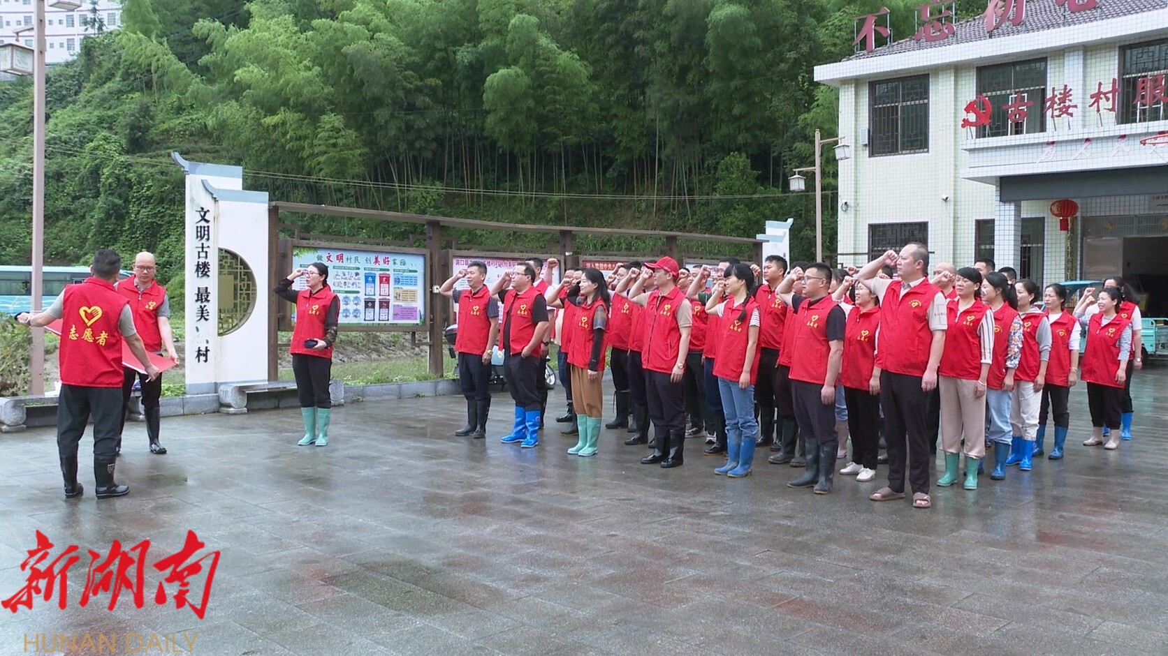 在古楼村新时代文明实践广场,师生们面向党旗庄严宣誓后奔赴各受灾现场。根据村落受灾情况,队伍被科学划分为多个作业小组,迅速投入清淤战斗。