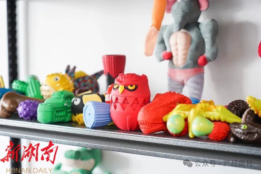 陶长丁手持一款猫头鹰造型的宠物玩具介绍道:“这款产品专为狗狗设计,采用天然橡胶材质,既耐磨又无毒。表面凸起结构帮助磨牙,内部可填充狗粮,背后的十字镂空设计让狗粮在玩耍时自然掉落,既解决了宠物进食的趣味性问题,也加强了玩具的互动性。”这类兼具功能性与创意的产品迅速赢得海外客户青睐,成为公司开拓市场的“拳头产品”。