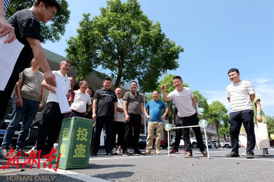在欢快的音乐声中,干部职工们纷纷从抽奖箱内抽取手环,依据颜色迅速组成四支队伍,队员们个个精神饱满、斗志昂扬,他们配合默契,展现出良好的团队合作能力。随后的趣味游戏环节更是将现场气氛推向高潮:“驱鸡纳吉”游戏中,队员们合力用蒲扇驱赶气球,欢笑声此起彼伏;“巧手钓粽”挑战中,大家屏息凝神,小心翼翼地钓起池中的粽子;“礼乐投壶”比拼眼力与技巧,木箭嗖嗖飞过,精准投入壶中,引来阵阵喝彩。