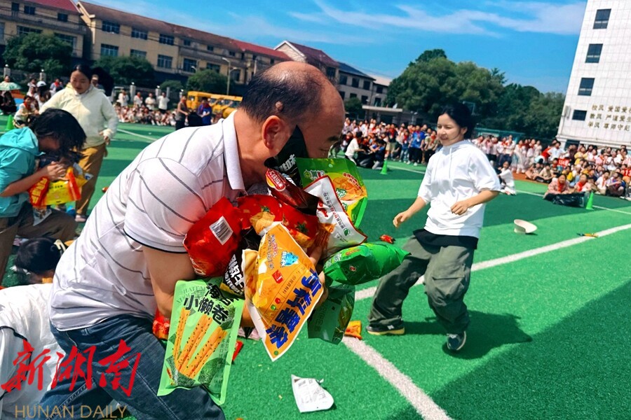 表演结束后,师生们还在操场上参加了别开生面的“抢零食大赛”。在30秒的倒计时内,各班班主任化身“超级英雄”,从指定起跑点奋力冲向堆满各种美味零食的“宝库”,老师们全力以赴,争分夺秒地为班级孩子们“抢”回喜爱的零食,现场加油声、欢呼声此起彼伏,气氛异常热烈。