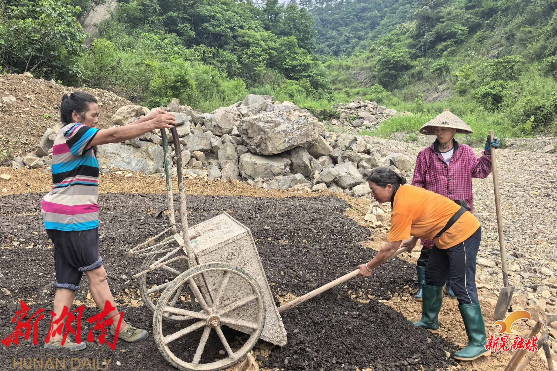 沿着蜿蜒的乡间小路步入基地,只见工人们正忙碌地推着斗车,将一车车锯木渣运到新播种的地里。这些锯木渣看似普通,实则大有用处。