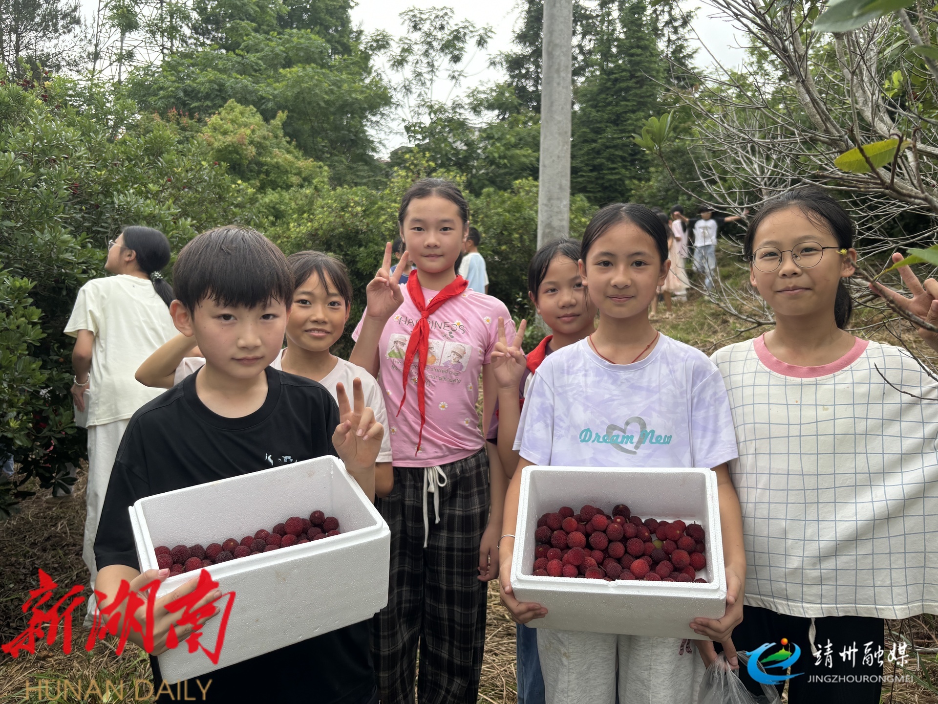 靖州融媒6月13日讯 (通讯员 邓昭霞 杨荔)6 月 12 日,靖州苗族侗族自治县新厂镇中心小学组织三至六年级学生到学校劳动实践基地,开展杨梅采摘劳动实践活动。