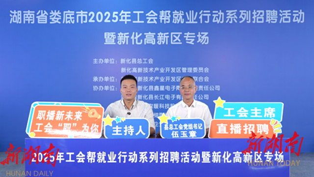 湖南日报·新湖南客户端6月13日讯(通讯员 张记甫 伍嘉媛)6月13日,湖南省娄底市2025年工会帮就业行动系列招聘活动暨新化高新区专场以线上带岗直播的形式火热开启。通过“云端”搭建精准对接平台,新化高新区全力为园区企业引才聚智,吸引广大求职者在线观看互动。