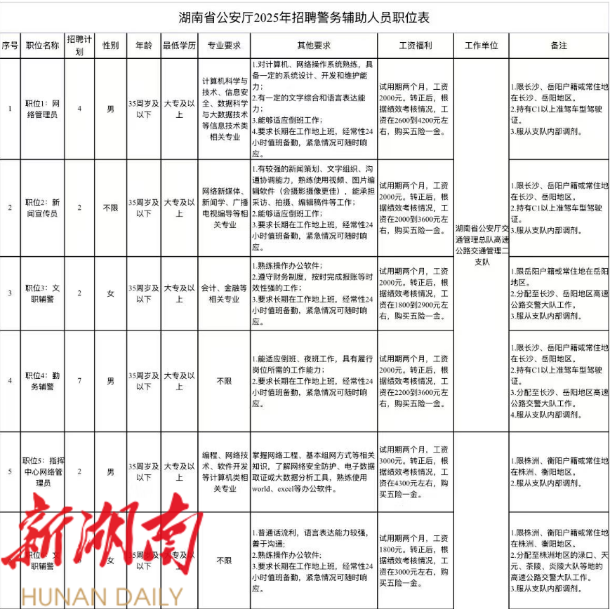6月12日,湖南省公安厅发布2025年招聘警务辅助人员公告,计划招聘339名警务辅助人员,包括指挥中心网络管理员、信息维护员、实战岗,及新闻宣传员、文职辅警、勤务辅警、指挥调度员等多个岗位,学历要求大专及以上。