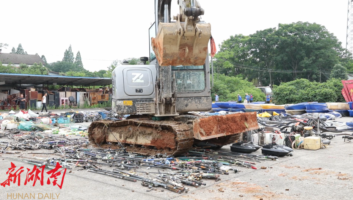 销毁现场,鱼竿、塑料船、充气船、电鱼设备等近两年来依法收缴的各类渔具堆积如山。工人们手持刀刃销毁各类充气船,一台挖掘机则来回碾压小件渔具,用挖斗销毁“三无”船舶。