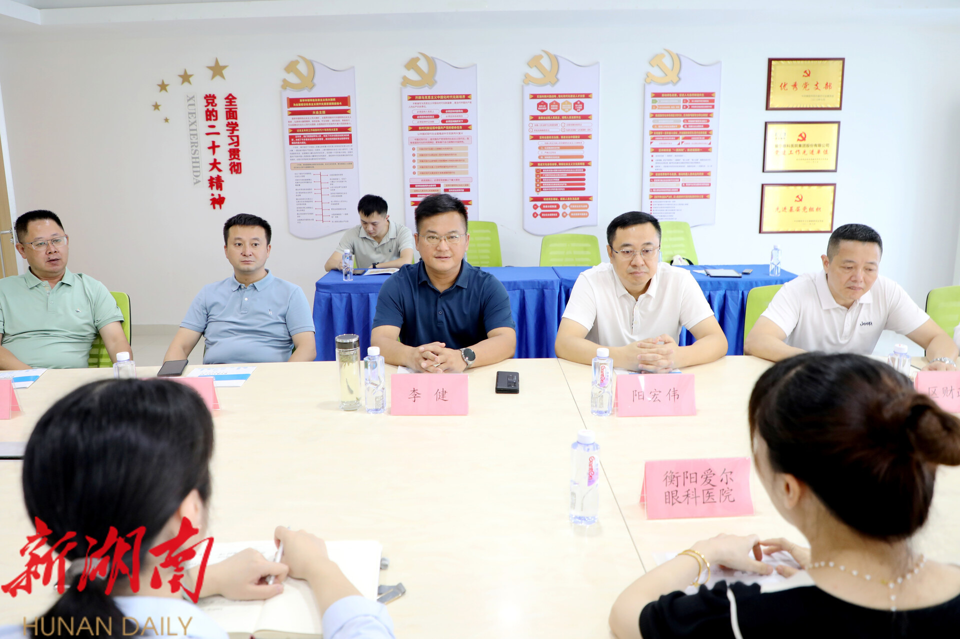 李健一行来到衡阳爱尔眼科医院有限公司,与企业负责人亲切交谈,详细了解企业经营发展等情况。他勉励企业要进一步提高生产力,创新发展思路,不断加强学科建设,做好医院精细化管理,推动医院健康发展;加大典型事例、经验的宣传力度,加强与各部门之间的合作,持续擦亮金字招牌。