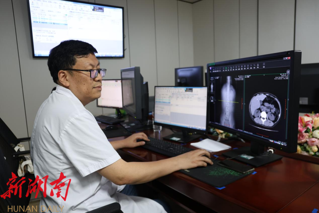 小塘镇的刘建军近日因为常感胸闷,便在镇卫生院拍片检查,就在他坐在CT室外等待结果的时间里,他刚刚所拍的胸部CT已由智慧系统直接同步到位于新邵县人民医院医学影像中心主任曾舫的电脑前。很快,一份由曾舫出具的诊断意见书就通过小塘镇卫生院CT室转给了刘建军。