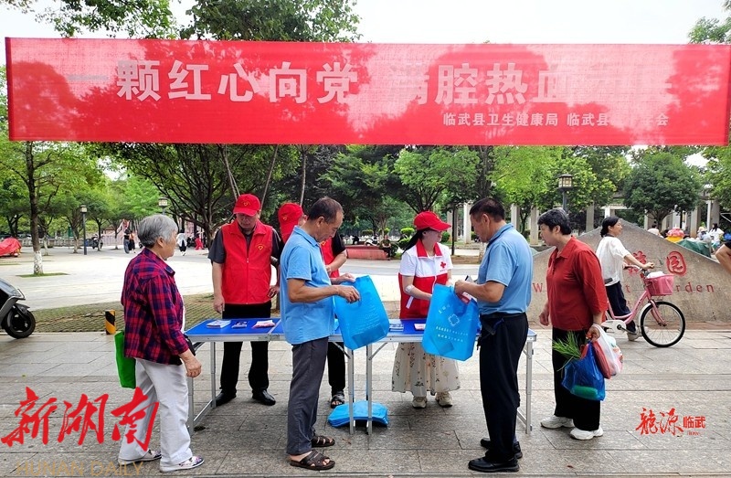 龙源临武客户端6月16日讯(通讯员 曹金银 陈鹏) 6月14日是第22个“世界献血者日”。6月13日,临武县卫生健康局联合红十字会、中医医院开展“献血传递希望 携手挽救生命”及“一颗红心向党,满腔热血为民”主题宣传服务活动。