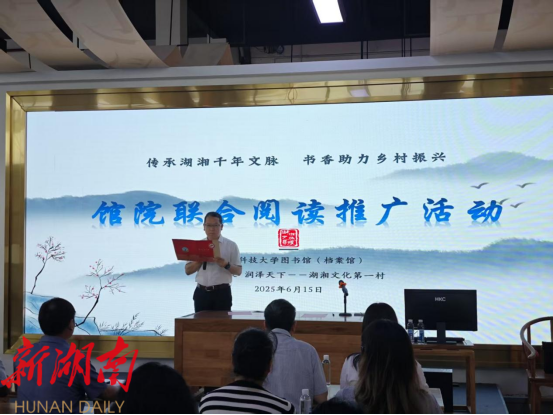 雨湖融媒6月16日讯 (通讯员 黄华)6月15日,“传承湖湘千年文脉 书香助力乡村振兴”馆院联合阅读推广活动在碧泉书院举行。本次活动由湖南科技大学图书馆与碧泉书院联合主办,以弘扬湖湘文化、激发阅读热情、推动高校与地方文化深度融合为核心目标,通过多元文化实践构建起“书香赋能乡村”的桥梁。