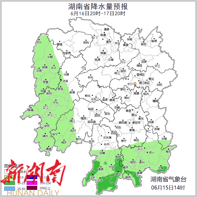 16日晚上至17日白天,晴天间多云,湘西、湘南有小到中等阵雨或雷阵雨;南风2~3级;最高气温湘中以北36~38℃,其他地区32~35℃,最低气温23~26℃。