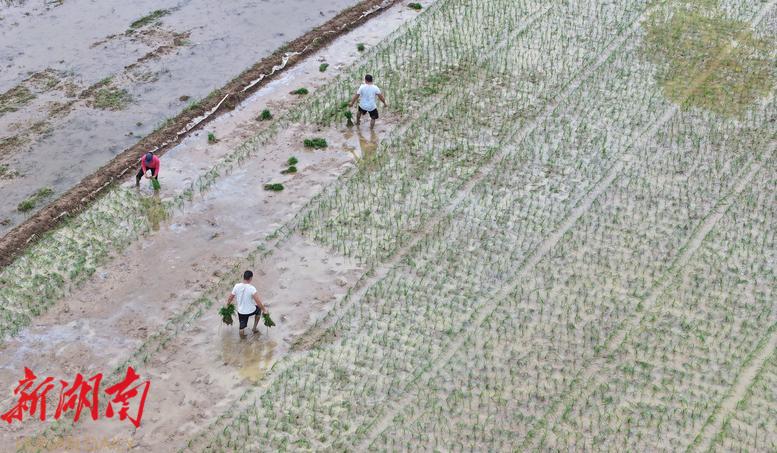 6月11日,湖南省永州市道县梅花镇贵头村村民在插中稻(无人机照片)。新华社发(何红福摄)