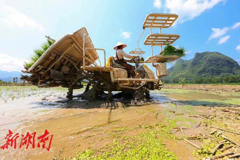 6月13日,在湖南省湘西土家族苗族自治州龙山县召市镇前卫村,农机手驾驶插秧机进行插秧。新华社发(曾祥辉摄)