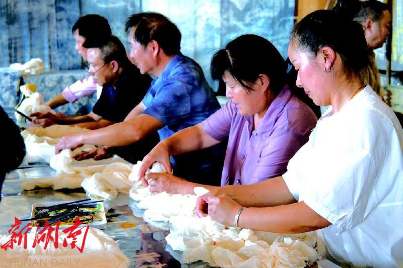 实际上,这种合作共赢已经有了具体的实践。“去年6月我们第一次举行‘行走的非遗课堂’后,就有许多非遗代表性传承人碰撞出火花。”市非物质文化遗产保护中心副主任欧阳继勇举例——夏布与菊花石融合,做出了菊花石夏布挂件香包;古山贡纸与小河木活字印刷在道官冲民宿联袂展示,游客可现场体验从古法造纸到木活字印刷的完整工艺流程;蒸解放每周五推出皮影戏专场演出,食客在品尝浏阳蒸菜的同时,还能观看非遗代表性传承人带来的《三打白骨精》等经典剧目。