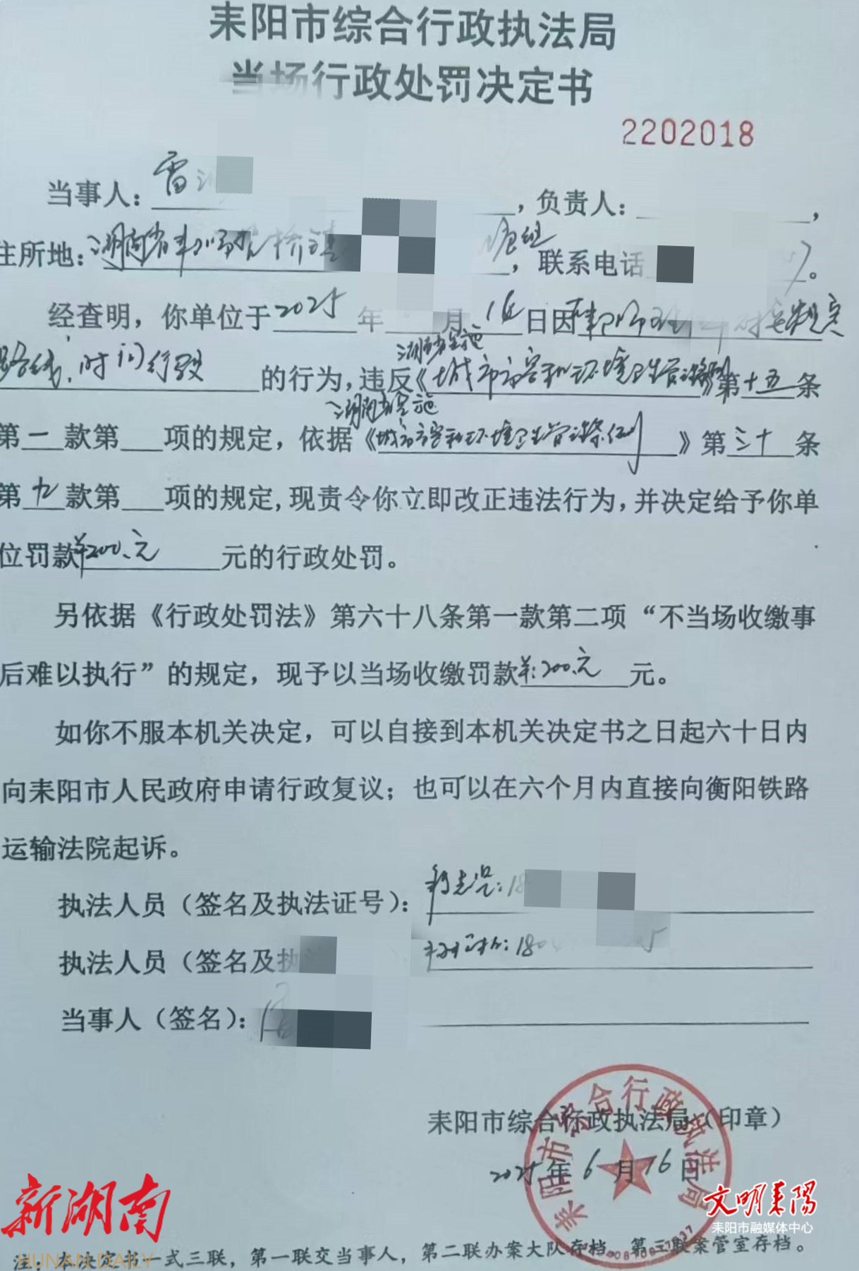 耒阳融媒6月16日讯(记者 刘喜) 6月16日,耒阳市城管局联合市综合行政执法局依法对驾驶员雷某未按规定路线、时间运输建筑垃圾的违法行为作出行政处罚决定,责令其立即改正,并处人民币200元罚款。