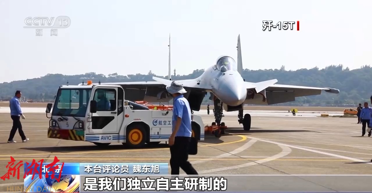 本台评论员魏东旭: 歼-15T和歼-15D在去年举行的中国航展上亮相,歼-15飞鲨是我们独立自主研制的双发重型的舰载机。此前在航母辽宁舰和航母山东舰上已经进行了部署,性能非常全面,作战能力在不断提高。在去年的航展上,我们看到了起落架经过加固的歼-15T,歼-15T也就是飞鲨的弹射版本,很可能会优先在航母福建舰上进行测试。